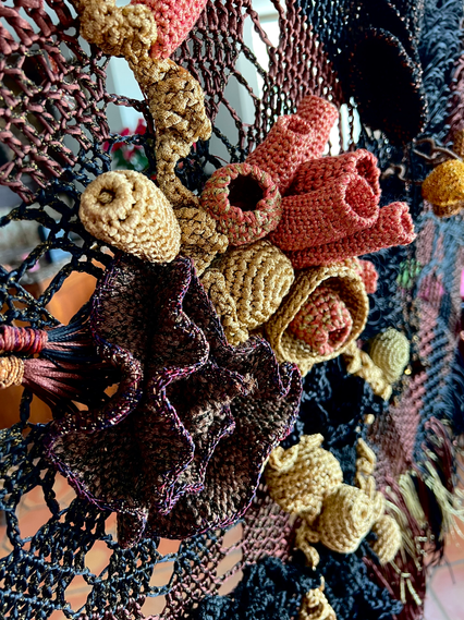 Min egen reise, fra tekstil- og strikkedesigner til kunstner, har vært preget av refleksjon og transformasjon. Restegarn fra fortiden har fått nytt liv i form av syntetiske materialer, tilpasset det sydlandske klimaet. Hver tråd, hver farge, er en manifestasjon av mine erfaringer gjennom livet og bringer med seg energien av vekst og fornyelse.