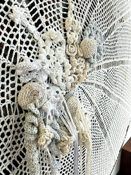 Cuore de Strega, eller hekseherte, er en fascinerende installasjon som fremhever soppene kjent som heksehjerter. Innimellom dukker disse merkelige skapningene opp i hagen, og deres mystiske natur har inspirert Carina til å lage en heklet versjon. Denne unike tolkningen inviterer oss til å utforske forbindelsene mellom natur, kunst og det magiske som finnes i omgivelsene.